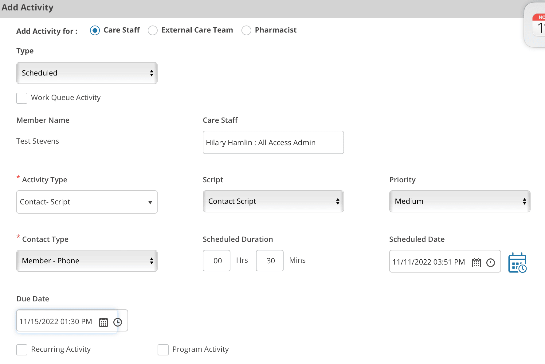 You can always add an activity that has not been scheduled. This might be because you had an activity that was not expected or to capture an activity for a member that was done by an external or other staff person.