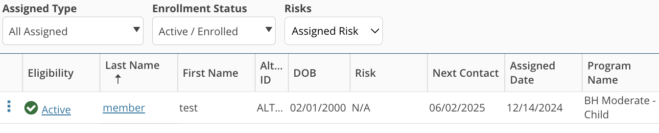 - Your clients will be displayed in a list here. You can filter by Assigned Type, Enrollment Status, and Risks.
