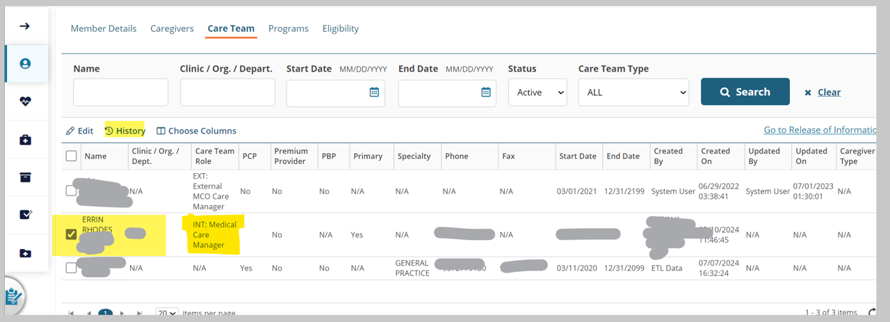 Understand that Care Team history shows based on Role, not Care Team Name.
